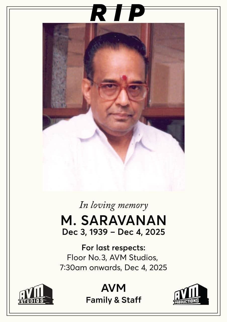 ஏவிஎம் ஸ்டுடியோ அதிபர் ஏவிஎம் சரவணன் காலமானார் Cinemaசெய்திகள் By Roja Tamil TV On Dec 4, 2025 30 Share சென்னை வடபழனியில் உள்ள ஏவிஎம் ஸ்டுடியோ ஏவிஎம் ப்ரொடக்ஷன்ஸ் நிறுவனங்களின் அதிபர் ஏவிஎம் சரவணன் வயது மூப்பு காரணமாக காலமானார். அவருக்கு வயது 86. சென்னை வடபழனி உள்ள ஏவிஎம் ஸ்டுடியோவில் அவருடைய உடல் பொதுமக்கள் அஞ்சலிக்காக வைக்கப்பட்டுள்ளது. avm productionavm saravananavm studiokollywood newstamil cinema newstamil film news 30 Share